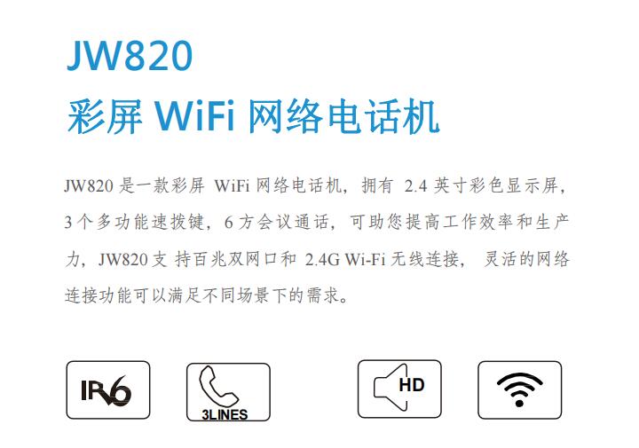 JW820是一款彩屏WiFi网络电话机,拥有2.4英寸彩色显示屏,3个多功能速拨键,6方会议通话,可助您提高工作效率和生产力,JW820支 持百兆双网口和2.4G Wi-Fi无线连接, 灵活的网络连接功能可以满足不同场景下的需求。