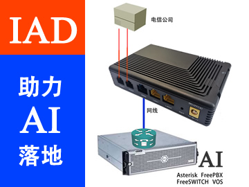 IAD-2O语音网关 在AI电销机器人落地应用中的组网拓扑图,如下图所示: IAD-2O为电销客户自备线......