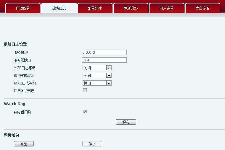 1. 在 Web 中登陆话机,选择路径:管理设置 -- 系统日志 -- 网页抓包。部分 X 系列的话机,路径在:系统 -- 辅助工具 -- 网络报文撷取。