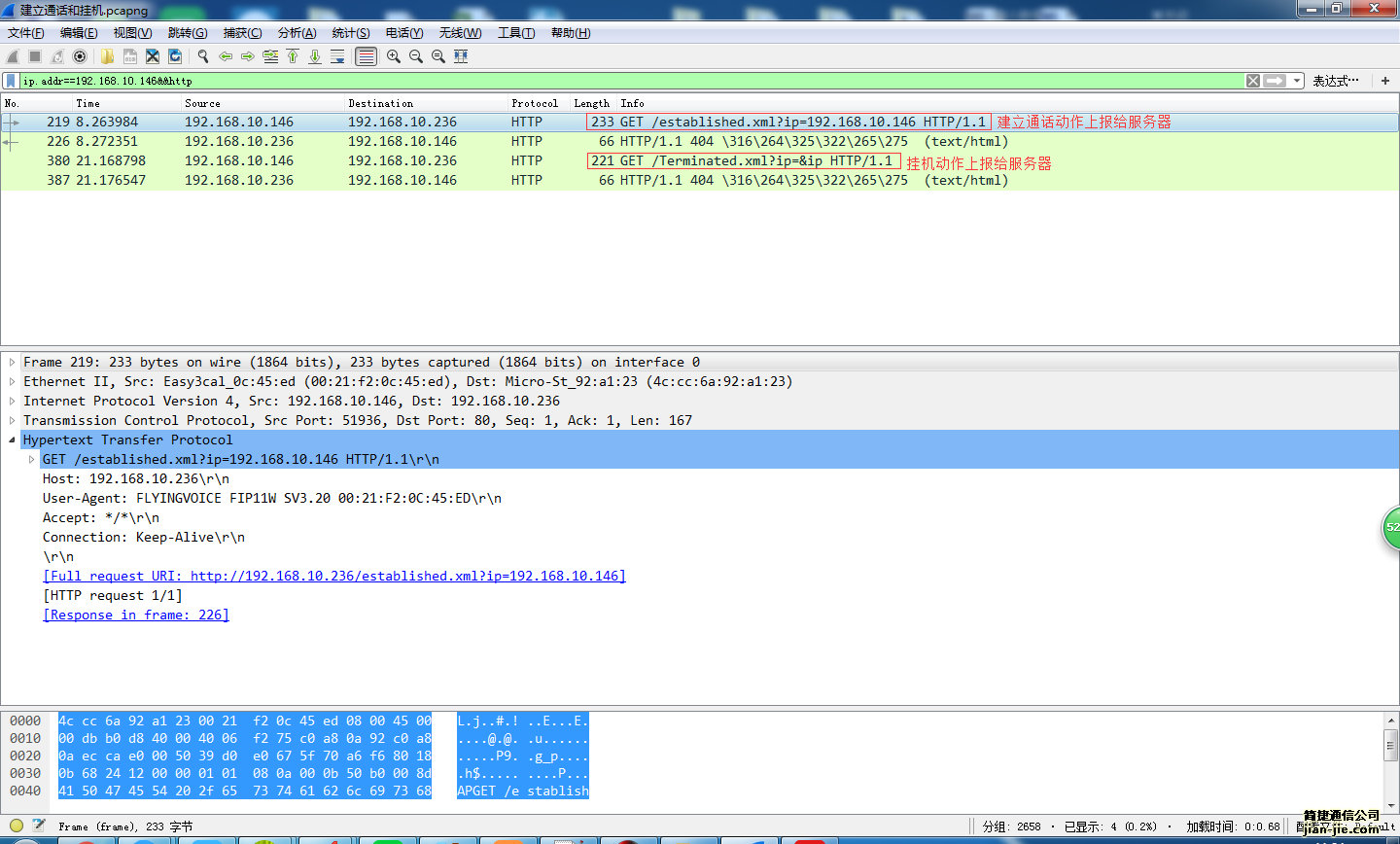 图中,http://192.168.10.236/established.xml?ip=$ip,192.168.10.236指的是http服务器地址,established指话机此时的状态为建立通话,ip=$ip表示本话机的IP地址。最终整条表示本话机建立通话时,服务器(192.168.10.236)收到ip地址为$IP的话机建立通话.报文如下: