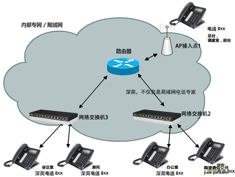 WiFi电话机等),配合局域网电话系统来实现局域网数据和电话的共荣共生。