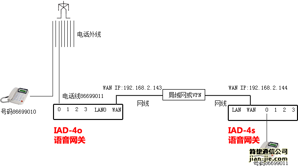 举例:总部电话交换机,交换容量充裕。需要将多条分机线接到语音网关的FXO口网关上,网关通过内部IP和各分点的语音网关对接。如下图所示的最简单的两点对接的方式,需要一个FXO网关和一个FXS网关: