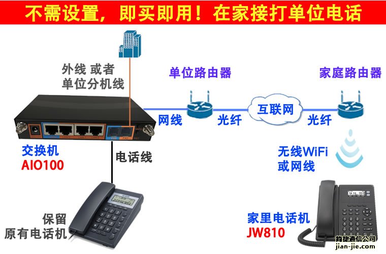 安装简单,无需设置。如下图,在单位里对交换机进行接线,共需要接入4条线 (电源线,网线,电话线):