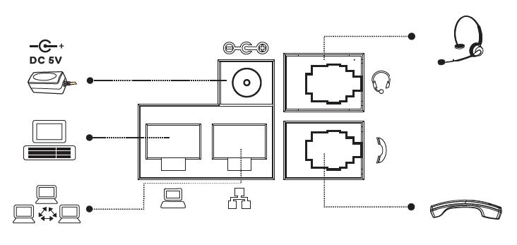 看一个简捷IP话机的后面接口,一般是并排两个网口。一个标有LAN或Internet的标志,一个标有PC的标志。