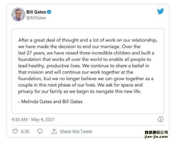 盖茨夫妇在联合声明中说,“在对我们的关系经过深思熟虑及各种尝试后,我们决定终止婚姻。在过去的27年里,我们已经养育了三个非凡的孩子,并建立了一个在全球范围内运作的基金会,来让所有人都能过上健康、充实的生活。我们仍对前述使命有共同信仰,并将继续共同为基金会工作。我们不再相信可以在下一人生阶段以夫妻的名义一起成长。在我们开始新的生活时,希望能为家庭提供空间和隐私。”