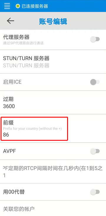 不,当你拨打电话的时候,会发现软电话在号码前自动加了一个前缀86。这个如何去掉呢?可以进入Linphone账号设置里,把这个前缀码删除掉,如下图: